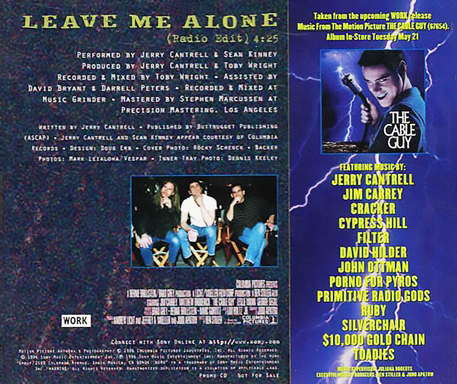 Leave Me Alone is the first solo song by Jerry Cantrell, the guitarist vocalist of the band Alice in Chains. It was released on May 10, 1996 by Sony Music, and produced by Jerry Cantrell and Toby Wright. The song was originally featured on the soundtrack to the 1996 film The Cable Guy and was also the film’s closing track. The song was released as a single and peaked at No. 14 on Billboard’s Mainstream Rock Tracks chart. A remixed version of the song was included on Jerry Cantrell‘s 2016 digital EP My Song.
