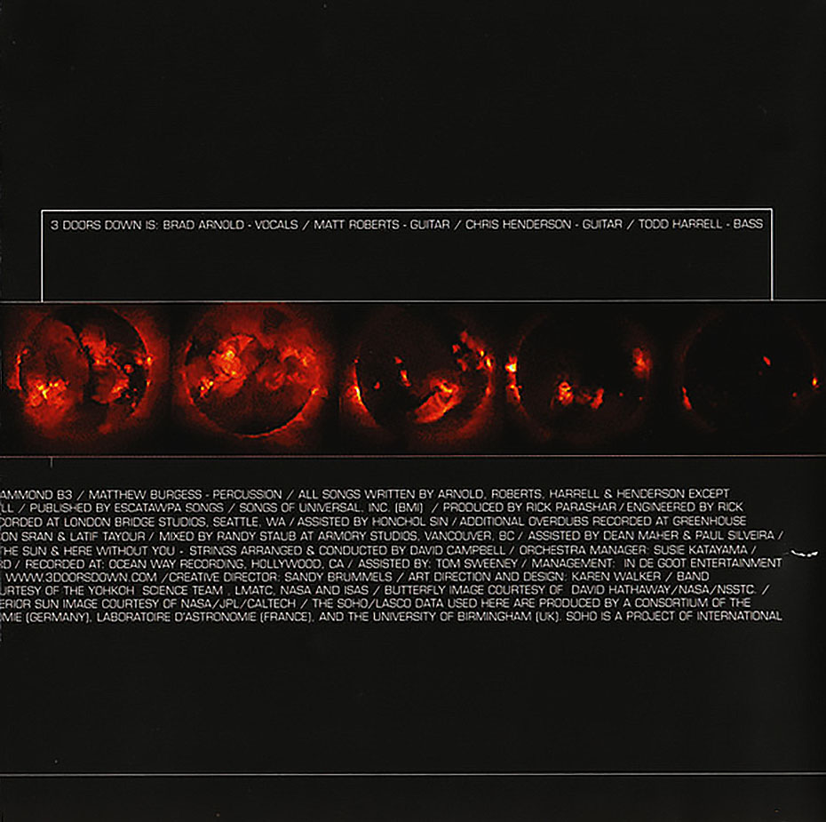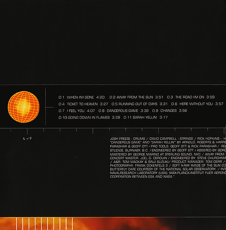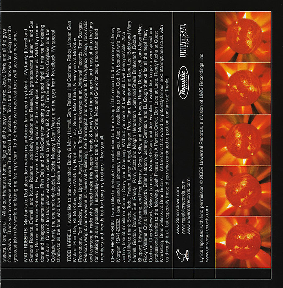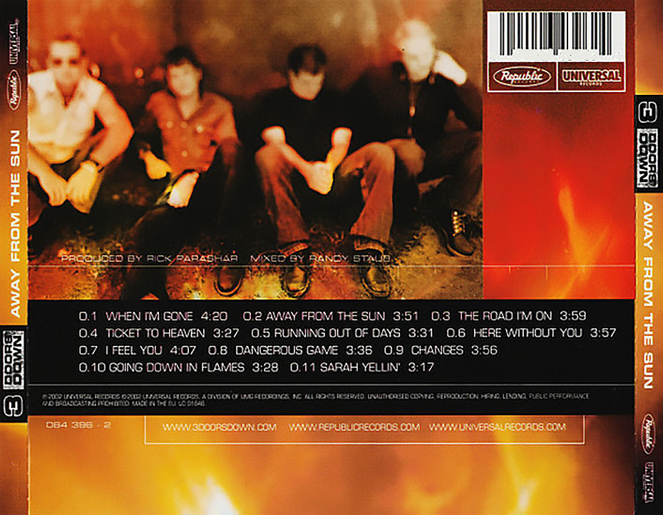 Away from the Sun is the second album by the rock band 3 Doors Down, released through Universal Records on November 12, 2002. Three of its four singles: “When I’m Gone“, “Here Without You“, and “Away from the Sun“, entered the Billboard Hot 100, peaking atnumbers four,five, and 62, respectively. The album received quadruple platinum certification by the Recording Industry Association of America (RIAA) on August 4, 2006.