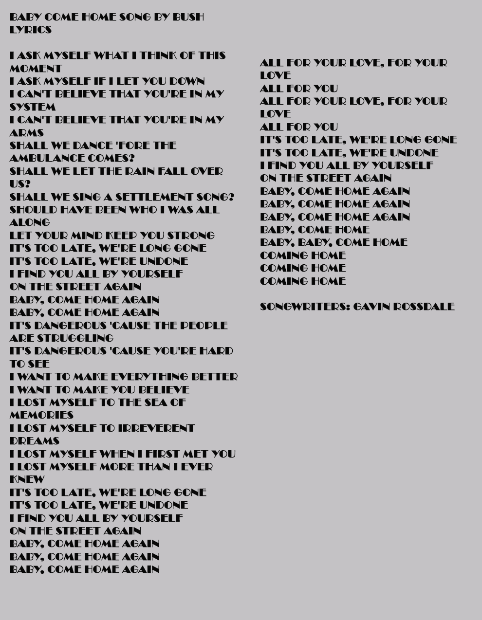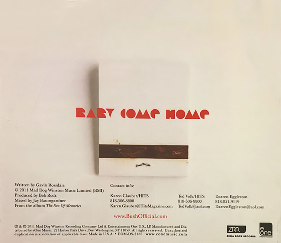 Baby Come Home is a 2012 song by British post-grunge band Bush from their fifth album The Sea of Memories. It was released as the third single on January 17, 2012. The music video was directed by Gavin Rossdale’s brother-in-law Todd Stefani. It is available on Bush’s VEVO account.