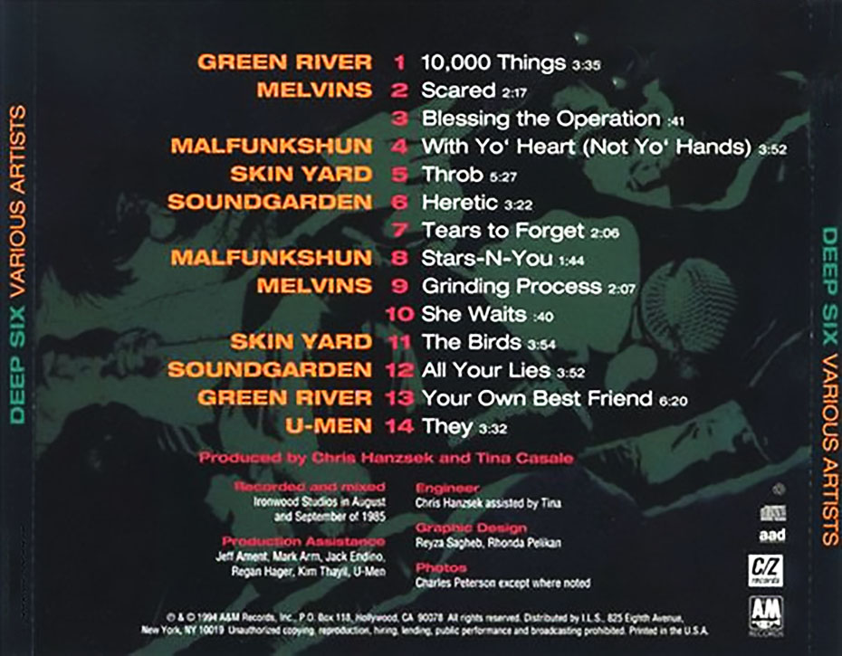 Green River had released its debut EP Come On Down several months before Deep Six; therefore, Come On Down is considered the first Grunge record. Members from this band would later form Pearl Jam and Mudhoney, two bands that would become internationally famous. However, Deep Six featured several other bands’ first appearance on record and is regarded as the first grunge compilation.