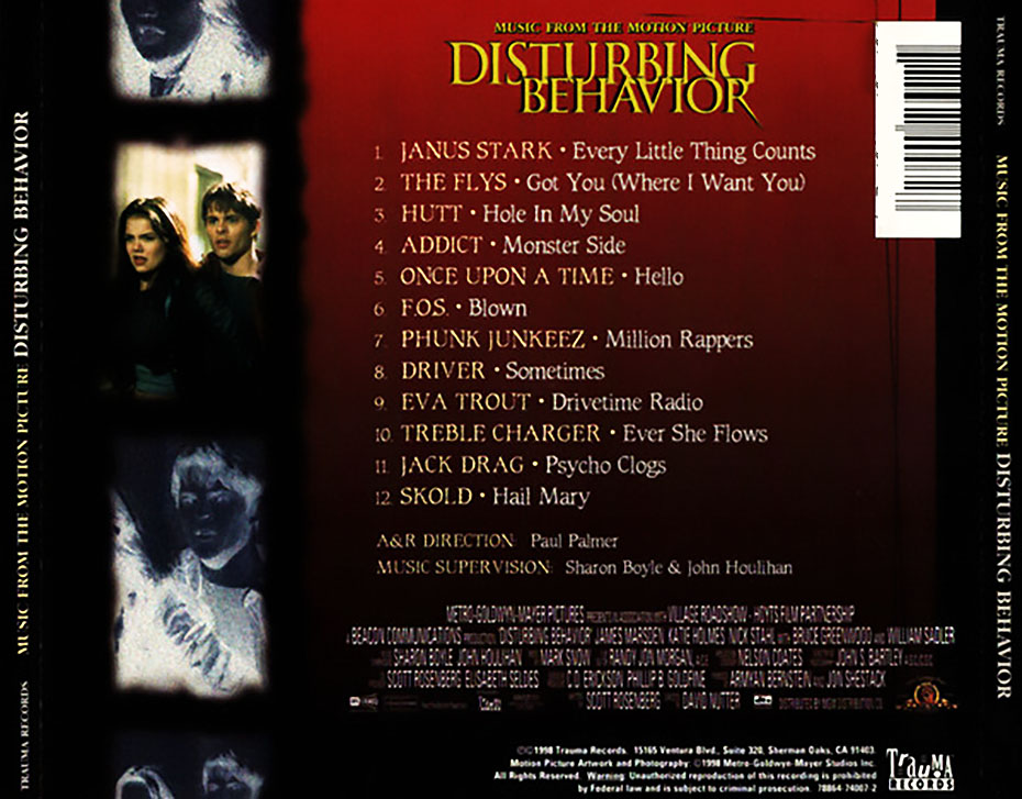 The plot follows a group of high school outcasts who discover their seemingly perfect Blue Ribbon classmates are part of an elaborate mind control experiment. The soundtrack for the film Disturbing Behavior was released July 28, 1998 and features 12 songs from the genres of alternative rock and post grunge.