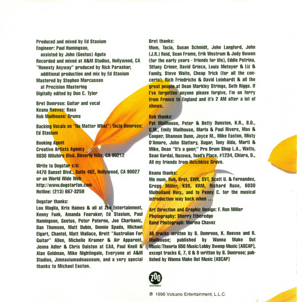 Dogstar is an American alternative rock band formed in 1994 in Los Angeles, California. The band consists of drummer Robert Mailhouse, bassist Keanu Reeves and guitarist/lead vocalist Bret Domrose (previously played bass with The Nuns), who joined in 1994 and later replacing founding member (Gregg Miller) in 1995 to become the vocalist, which he has been since 1995. They were initially active from the mid-1990s to the early 2000s, during which time the band found moderate success and garnered media attention due to Reeves’ status as a Hollywood actor.