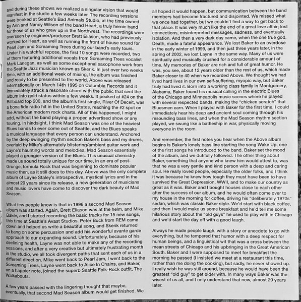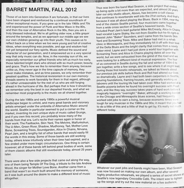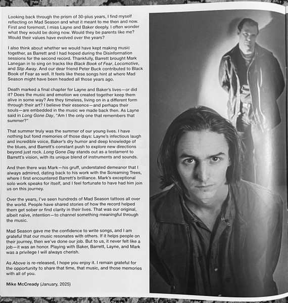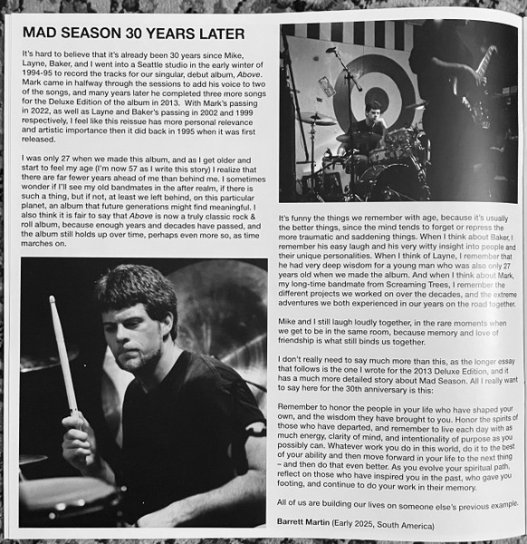 Above album by Mad Season 30th Anniversary Edition was released on May 16, 2025. Released in 1995, Above was a groundbreaking album that united members of iconic bands: Barrett Martin (Screaming Trees), Mike McCready (Pearl Jam), Layne Staley (Alice in Chains), and John Baker Saunders (The Walkabouts). The album quickly became a cultural touchstone, going on to sell over a million copies and becoming a must-have for fans of grunge and alternative rock. The newly Above album remastered, double vinyl edition include 3 additional songs that Mark Lanegan sang from the attempted 2nd album unfinished (Locomotive, Black Book Of Fear, Slip Away).