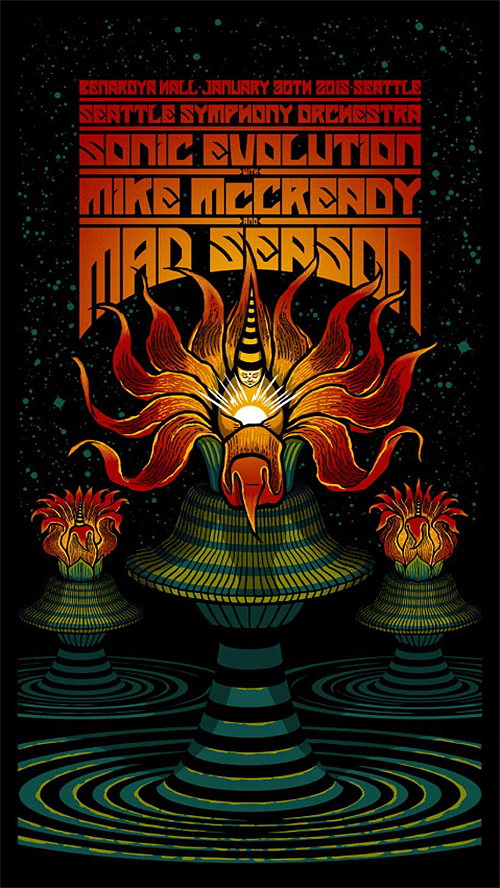 The Mad Season performance also included artists Jeff Angell, Kim Virant, Sean Kinney (Alice In Chains), Skerik and Tim Dijulio. Additionally, Jeff Ament and Stone Gossard from Pearl Jam guest starred that evening and alongside Cornell, McCready, and Cameron, performed songs as Temple Of The Dog. Sonic Evolution was the result of a year long artistic collaboration between Mike McCready and Seattle Symphony Music Director Ludovic Morlot. The performance has been immortalized by Monkeywrench Records in Mad Season / Seattle Symphony: Sonic Evolution / January 30, 2015 / Benaroya Hall.