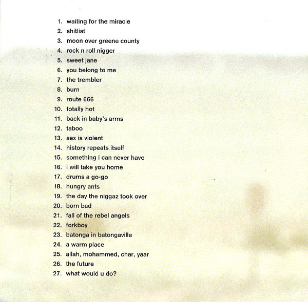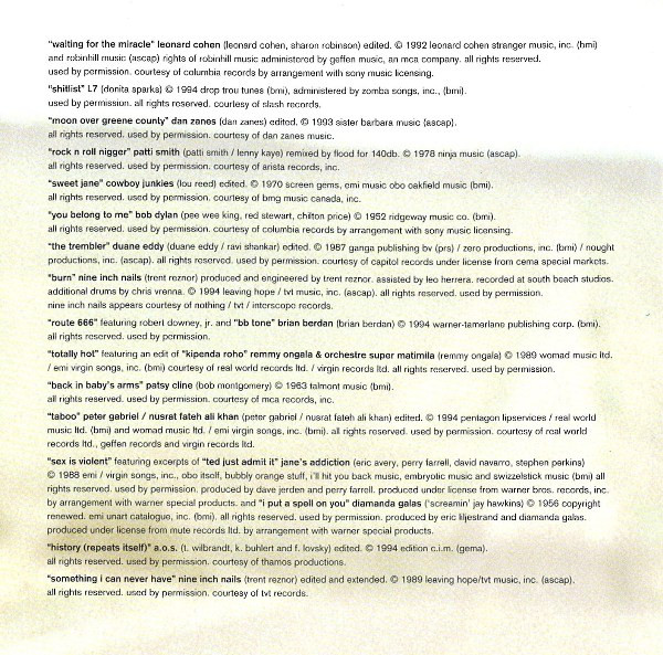 These tracks are not included on the soundtrack album. Also includes samples of Leader of the Pack by The Shangri-Las, and Steven Jesse Bernstein‘s No No Man-Part 1. Tracks 9, 10, 13, 18, 21, 23 and 25 are assembled from various recordings and dialogue from the film. The bathroom scene of this film contains a non credited selection from the MelvinsHoudini; specifically, the surreal percussion track Spread Eagle Beagle.