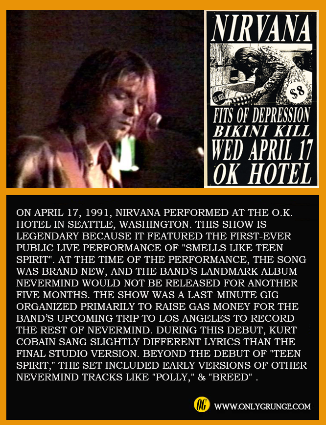 On April 17, 1991, Nirvana performed at the O.K. Hotel in Seattle, Washington. This show is legendary because it featured the first-ever public live performance of “Smells Like Teen Spirit“. At the time of the performance, the song was brand new, and the band’s landmark album Nevermind would not be released for another five months. The show was a last-minute gig organized primarily to raise gas money for the band’s upcoming trip to Los Angeles to record the rest of Nevermind. During this debut, Kurt Cobain sang slightly different lyrics than the final studio version. Beyond the debut of “Teen Spirit,” the set included early versions of other Nevermind tracks like “Polly,” & “Breed“.
