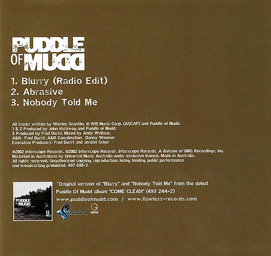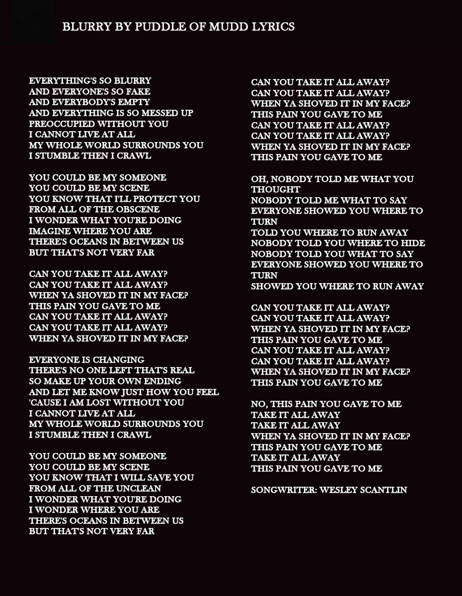 “Blurry” is a song by the rock band Puddle of Mudd, released on October 16, 2001, as the second single from the band’s debut album Come Clean (2001). It was 2002’s most successful rock song in the United States, topping the Billboard Mainstream Rock and Modern Rock Tracks charts as well as their year-end listings. “Blurry” also found success outside the US, reaching the top 20 in Ireland, New Zealand, and the United Kingdom.