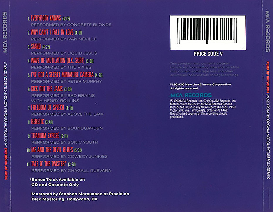 Pump Up the Volume (Music From the Original Motion Picture Soundtrack) is the soundtrack album to Allan Moyle’s 1990 comedy-drama film Pump Up the Volume. It was released on August 14, 1990 through MCA Records. The album peaked at number 50 on the US Billboard 200 chart. Music being central to the plot of a film about a young pirate radio station DJ, the soundtrack featured a diverse number of artists. The official soundtrack release had eleven tracks.