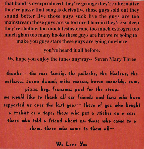 Churn is the debut studio album by the post-grunge band Seven Mary Three. It was independently released in 1994, and preceded the band’s mainstream breakthrough, American Standard. Churn also included two songs that would be re-recorded and go on to be among Seven Mary Three‘s biggest singles. Of all the songs on the album, “Kater” was the only one that wasn’t re-recorded for the band’s major label debut, as the band sold the song off to a Chapel Hill based band called Stuntcock, who intended to release their own version of it as ‘Casey the Madison King”, though it is unknown if that ever came to fruition. The album was re-released several years later with different album artwork. It was again re-released on December 9, 2008 via digital music sellers and the band’s website.