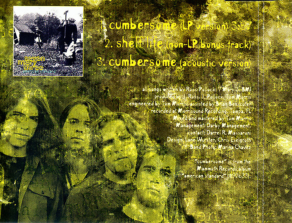 “Cumbersome” is a song by the rock band Seven Mary Three and the lead single from their breakthrough album, American Standard (1995). It was originally included on their independently released debut, Churn, in 1994. The single was released in January 9, 1996 and became the band’s most popular and well-known song. “Cumbersome” reached number one on the Billboard Mainstream Rock Tracks, number seven on the Modern Rock Tracks, number 39 on the Billboard Hot 100, and on their list of Hot Mainstream Rock Tracks of the Year, the song ranked in at number five for 1996. An acoustic version of the song is included on the “Cumbersome” and “Water’s Edge” CD singles. A live version appears on Live in the X Lounge IV, released in 2001.