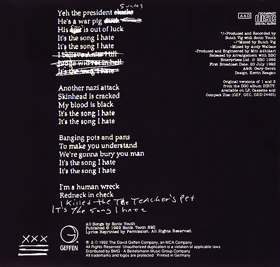 The semi-acoustic track “Purr” was taken from a Mark Goodier BBC session from July 20, 1992. A live version of “The Destroyed Room” was previously released on the “Dirty Boots” single under the title “The Bedroom” .The music video for “Youth Against Fascism” was directed by Nick Egan. The video was shot in the concrete flood control channel of the Los Angeles River, with the band playing while FMX bikers ride around. Imagery of fascism, Nazism and communism was spliced into the video.