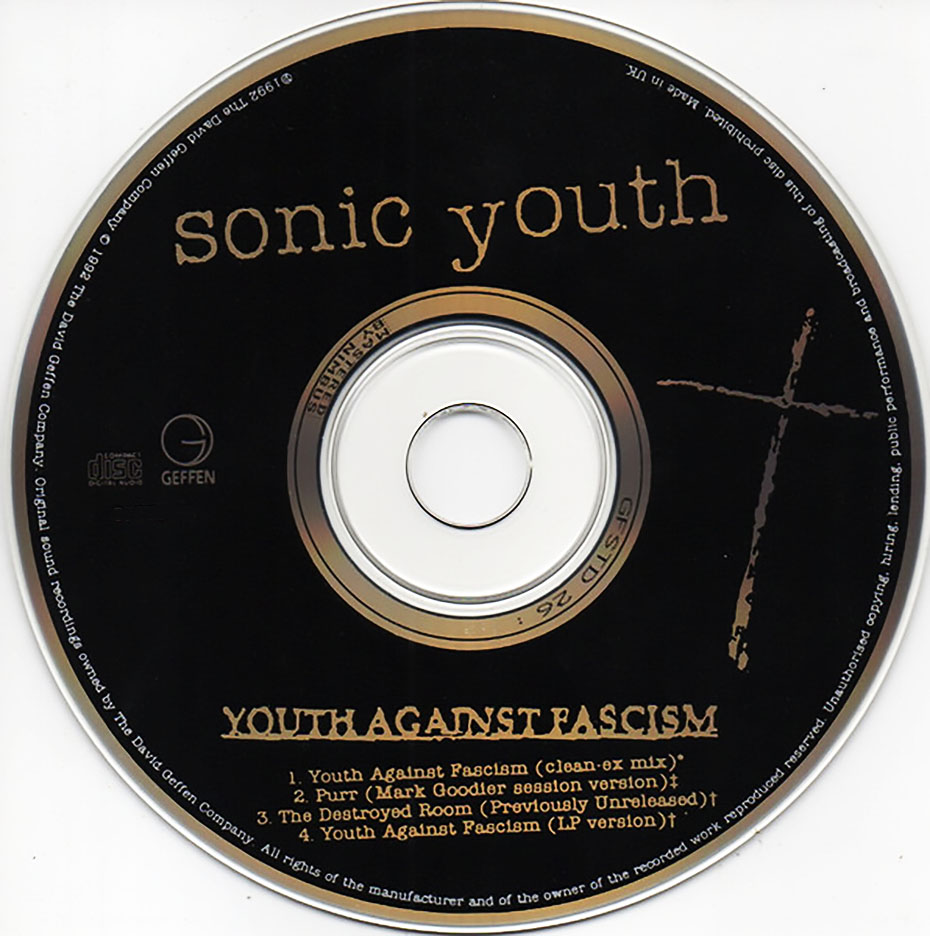 Youth Against Fascism is the second single from Sonic Youth‘s 1992 album Dirty. It was released in October 5th1992 for a US promo and October/December 1992 for UK physical releases. Ian MacKaye of Minor Threat and Fugazi contributed additional guitar parts to the track.