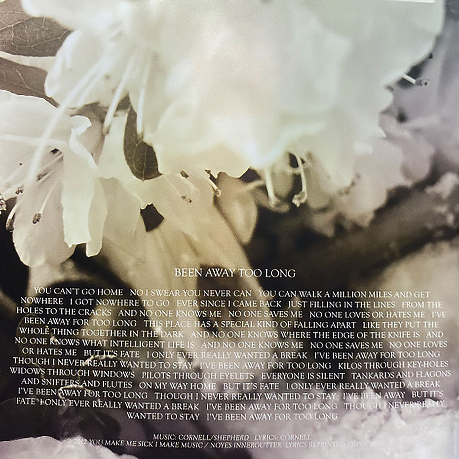 Been Away Too Long is a song by Soundgarden, appearing on their sixth studio album King Animal (2012) as the opening theme. Been Away Too Long was released on September 27, 2012, as the first single from the album. Chris Cornell stated that the title Been Away Too Long came to him while he was listening to the radio trying to sleep, while Soundgarden began preparing King Animal. He forgot about it until another sleepless night at the end of production, where he decided to apply it to a song the band had been working on but had no lyrics yet. The music for Been Away Too Long began with a demo that Cornell did in a fairly compact form without a bridge”, a part provided later by bassist Ben Shepherd.