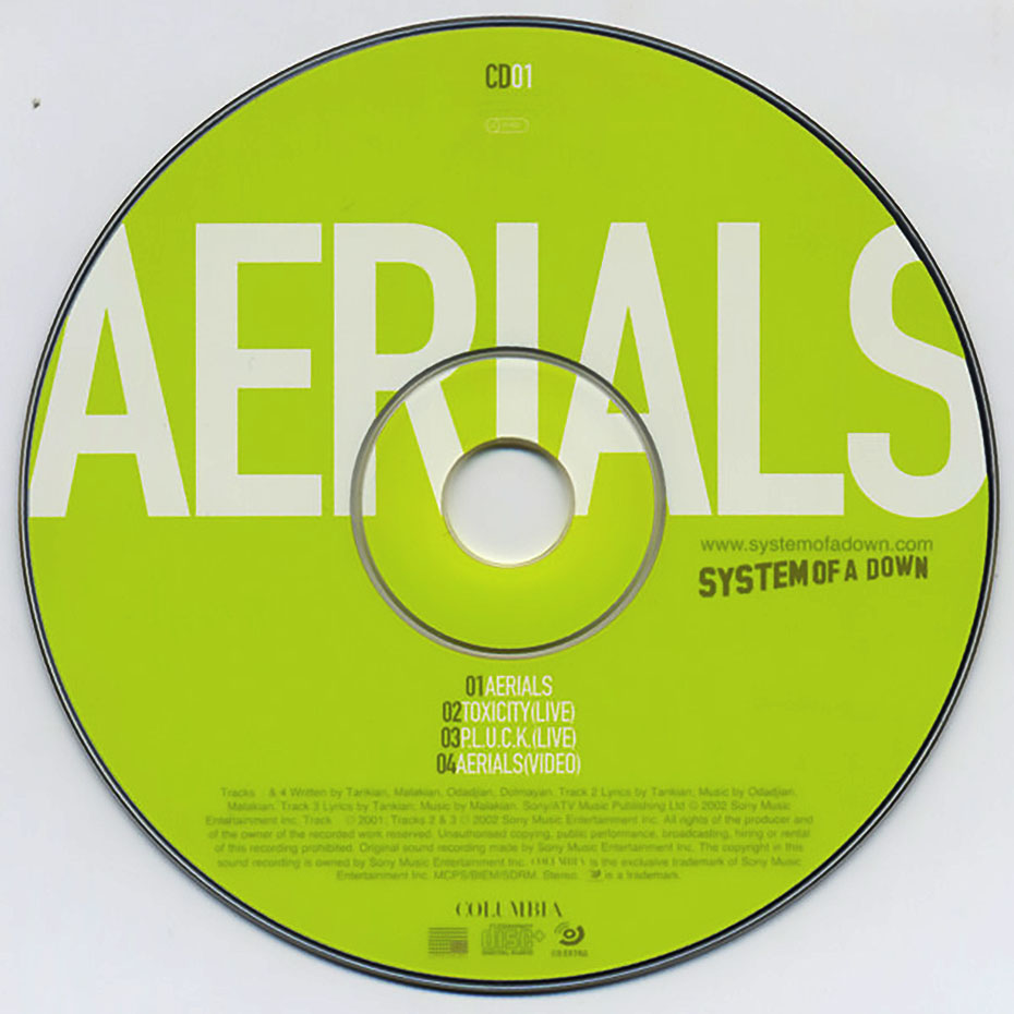 Aerials is a song by System of a Down. It was released on June 11, 2002 as the third single from their second album Toxicity, which earned the band its second Grammy Award nomination for Best Hard Rock Performance in 2003. The song hit number one on both the Billboard Alternative Songs and Mainstream Rock chart. It was System of a Down’s first number one hit.