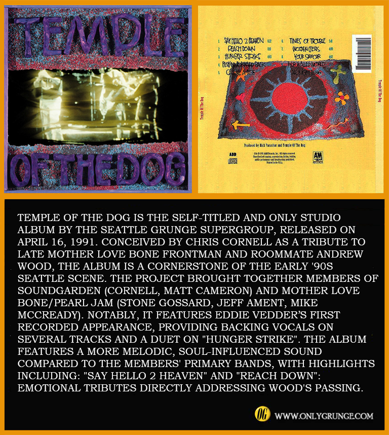 Temple of the Dog is the sole studio album by the Seattle supergroup Temple of the Dog, released on April 16, 1991. Conceived by Soundgarden‘s Chris Cornell as a tribute to late Mother Love Bone singer Andrew Wood, the project features members of Soundgarden and Pearl Jam, including Eddie Vedder, Mike McCready, Stone Gossard, Jeff Ament, and Matt Cameron.