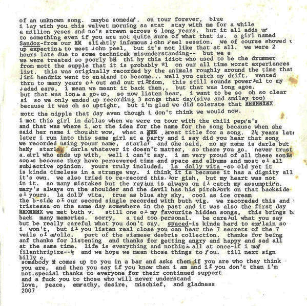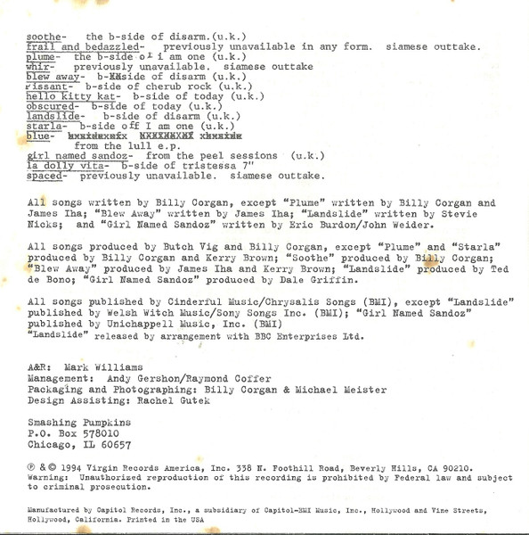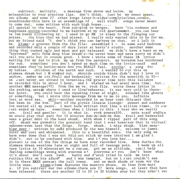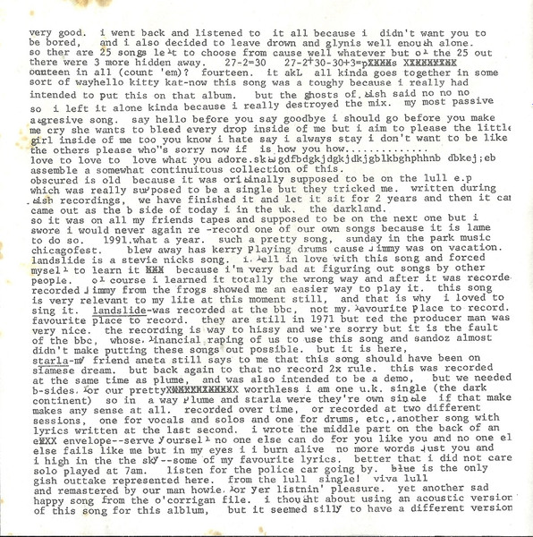 Different release formats of the album received their own separate artwork, such as the LP and cassette releases. The liner notes of Pisces Iscariot contain Corgan‘s commentary on each of the album’s 14 tracks. Presented in a typed format, the notes provide background on the songs, though the writing style has been described as difficult to decipher.