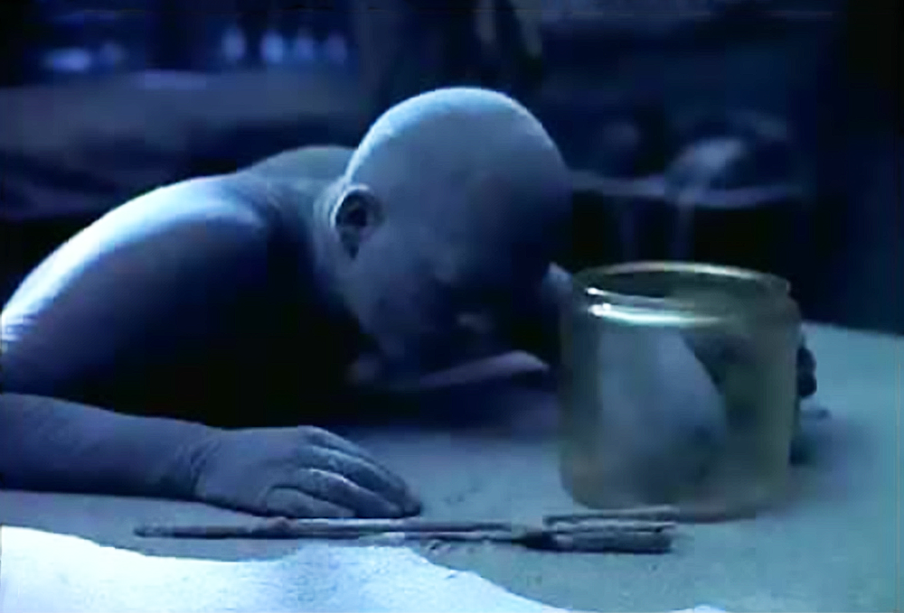 They suck on tubes and swallow nails and wires that apparently hurt them and are ejected from their bodies, after which they are put into the jars and treasured. Another race of mutants has entrails that are plugged into a wall.